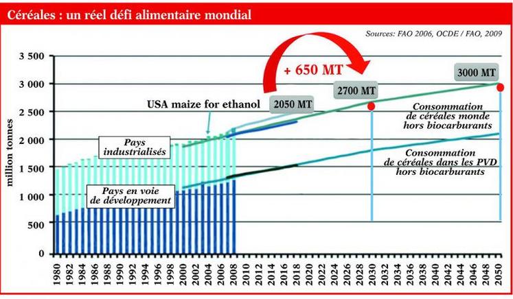 «Entre les années 2010 et 2030, le besoin en céréales dans le monde, à savoir le blé et le maïs essentiellement, devraient croître de 650 000 tonnes par an environ (Cf graphique). Cette progression des besoins pourrait atteindre un million de tonnes à l’échéance 2050. C’est pourquoi, selon Orama, produire est une obligation morale», a expliqué Jérôme Josseaux.