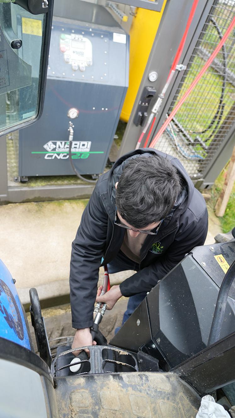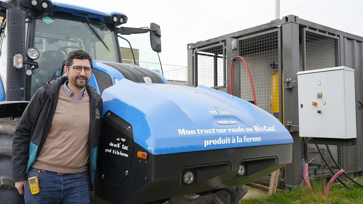 En 2022, Cyrille Stresser, agriculteur à Besny-et-Loizy (Aisne), se lance dans la méthanisation en lien avec des associés qui ont une autre unité en Seine-et-Marne. «Nous voulions un projet innovant pour se démarquer.» L’idée de la station BioGNV (biogaz naturel pour véhicules) séduit l’agriculteur. D’autant qu’il envisage l’achat de deux ou trois véhicules de ferme au biogaz. Pour lui, ce concept offre une belle image de l’agriculture. Mais les constructeurs automobiles font marche arrière et ne produisent plus de véhicules utilitaires neufs. En août 2024, il récupère un tracteur New Holland T6 180 de 155 chevaux issu d’un programme triennal lancé par l’Ademe, GRDF et l'Association des agriculteurs méthaniseurs de France (AAMF) pour la promotion des tracteurs au gaz, faire des essais, obtenir des références techniques concrètes. «J’avais un contrat jusqu'en septembre 2025 pour faire les tests et soit je m’en séparais, soit je l’achetais.