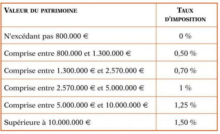 Les personnes détenant plus de 1,3 million de patrimoine taxable, sont concernés par l’ISF. La valeur de leur patrimoine retenu pour le calcul est celle évaluée au 1er janvier 2013. En fait, le nouveau barème progressif, taxe le patrimoine entre 0,50 % et 1,50 %. Le seuil de déclenchement du paiement de l'impôt reste fixé à 1,3 million d’euros, mais le patrimoine des personnes concernées est imposé à partir de 800 000 € (voir tableau). La réduction pour enfant à charge a été supprimée.