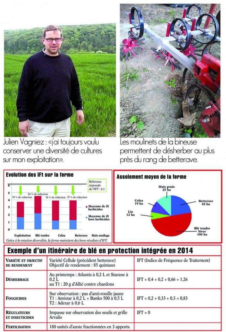 «Mon objectif, poursuit-il, est d’optimiser la marge économique. C'est dans cette optique que je me suis engagé dans la réduction de l'usage des phytos». Dès son installation en 2004, Julien Vagniez a pratiqué la protection intégrée sur les blés : choix de variétés tolérante à la verse et à la septoriose, semis fin octobre, désherbage au printemps, impasses sur les régulateurs et sur les insecticides la plupart des années, observation des seuils pour les maladies, sans réduction particulière de dose.