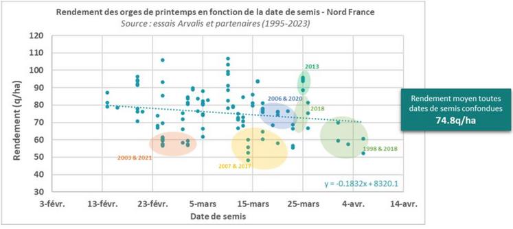 Quand on analyse les rendement régionaux des orges de printemps en fonction de la date de semis, on observe bien que plus on décale la date de semis plus le rendement diminue et, passé le 15 mars, on prend le risque d’être en dessous de la moyenne pluriannuelle et d’affecter la productivité. Mais, dans nos sols profonds, il n’est pas rare de voir des semis plutôt tardifs avec de bons résultats à la moisson, principalement lorsque le climat lors de la montaison et du remplissage est favorable (2013 ou 2018) ou à l’inverse des semis à des dates «classiques» qui déçoivent en raison de printemps secs (2003, 2017, 2021) ou de conditions très mauvaises pendant le remplissage (comme en 2007). Les mauvaises performances, quelle que soit la date de semis, s’explique par un déficit de pluies entre le semis et l’épiaison, et une densité épis en retrait.
