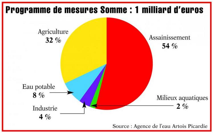 L'ensemble des programmes va mobiliser 4,8 milliards d’euros pour le bassin dont un milliard pour la Somme (voir répartition en encadré). Certaines mesures devront être étalées sur plusieurs programmes lorsqu’il n’est pas techniquement possible de les mettre en œuvre sur les six ans. Les mesures feront l’objet d’une analyse économique pour en évaluer le caractère supportable par les ménages et les acteurs économiques, et vérifier si leur coût n’est pas disproportionné par rapport aux résultats attendus.