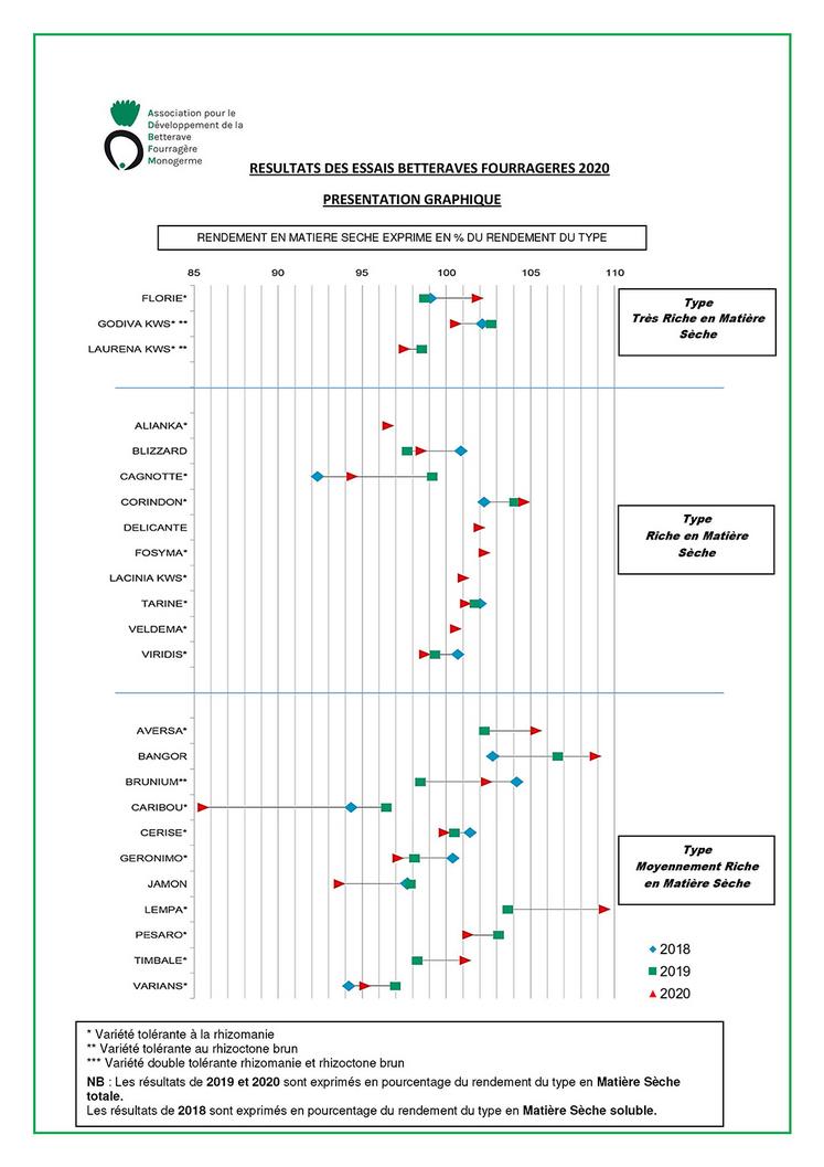 - Le type «très riche en MS» : ces variétés plus récentes sont aussi les plus productives en terme de matière sèche par hectare. Leur teneur élevée en sucres solubles limite leur utilisation à des rations bien adaptées. Elles doivent être distribuées en morceaux.
