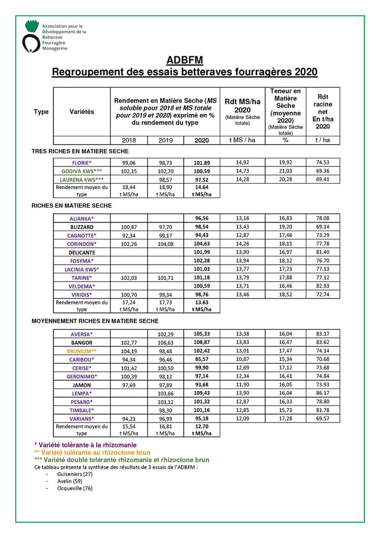 (+ 6,6 % en moyenne sur cinq ans). Cette augmentation des surfaces traduit l’intérêt croissant des éleveurs pour cette culture très productive et qui, année après année, démontre sa tolérance face aux aléas climatiques. En parallèle, l’offre variétale continue de s’étoffer proposant une large gamme de variétés adaptées à tous les animaux et à tous les usages, du pâturage jusqu’aux rations mélangées. L’ADBFM* (Association pour le développement de la betterave fourragère Monogerme), met en place, depuis plus de vingt ans, un réseau d’essais qui lui permet d’évaluer les variétés de betteraves fourragères. Trois essais, avec un protocole commun, ont été semés cette année dans l’Eure, la Seine-Maritime et le Nord. Chaque essai comporte les mêmes variétés et suit un dispositif à quatre répétitions.