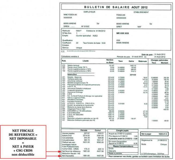 Pour la fiche de paie du mois d’août 2012, il n’y a aucune incidence sur le calcul de l’assiette de le CSG CRDS (hors heures supplémentaires) mais le net fiscal de référence est égal au net imposable puisqu’il n’y a plus aucune réduction fiscale sur heures supplémentaires.