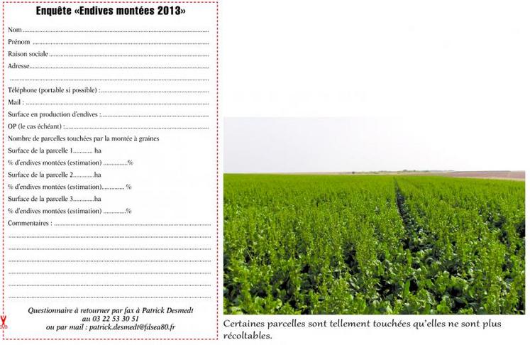 Selon Olivier Darras, administrateur à l’Union des producteurs d’endives de France, certaines parcelles sont tellement touchées qu’elles ne sont plus récoltables. La Fdsea a saisi la Ddtm pour envisager une procédure de calamités et une mission d’enquête va être organisée dans les prochains jours. En vue de cette enquête de terrain, il faut éviter de détruire ces endives montées, du moins sans laisser des zones «témoins». Pour mieux connaître l’ampleur des dégâts et les zones les plus touchées, la Fdsea recense dès à présent les producteurs touchés, pour estimer la perte individuelle et globale. Pour ce faire, les endiviers voudront bien compléter le questionnaire ci-contre.