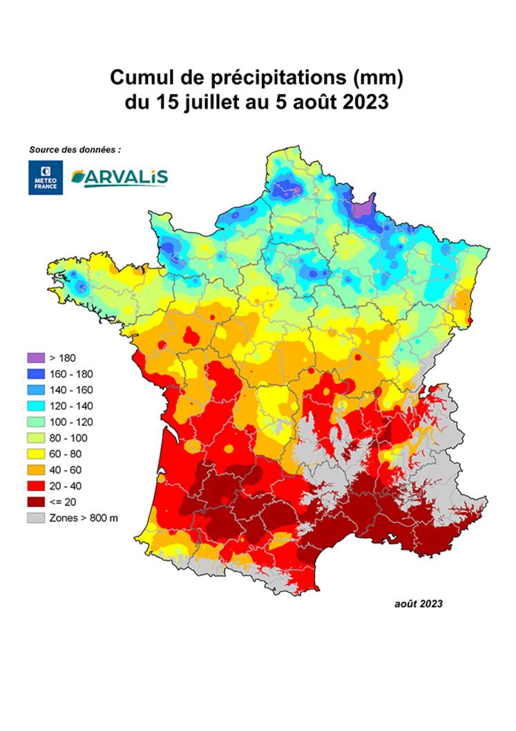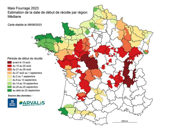 Pour chaque secteur, les experts d’Arvalis ont défini le groupe de précocité dominant et la date médiane des semis 2023. Avec les données météorologiques de l’année en cours et les données statistiques sur les semaines à venir, il est possible de prévoir une période à laquelle le stade optimal de récolte, autour de 32-33 % de MS plante entière, sera atteint. Cette carte prend en compte la météo réelle jusqu’au 7 août et sept jours de météo prévisionnelle.