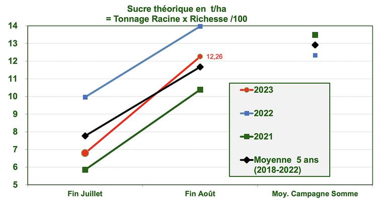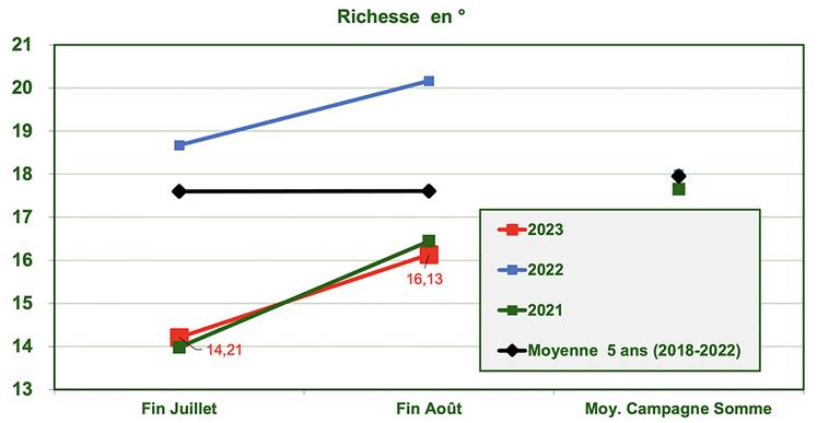 • Nous constatons à ce jour une richesse basse pour cette date : 16°1 soit 1,5° de moins que la moyenne cinq ans. Cette richesse s’explique par les pluies abondantes de l’été, mais aussi par la date moyenne des semis plus