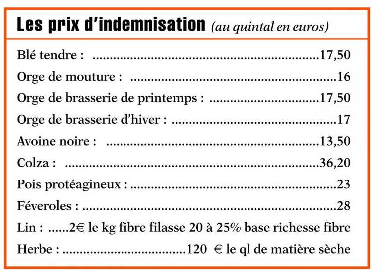 La commission départementale d’indemnisation des dégâts de gibier, réunie le 16 octobre, a fixé le prix de certaines denrées : blé tendre, orge de mouture, orge de brasserie de printemps, d’hiver, avoine, seigle, colza, pois, féveroles, lin.
