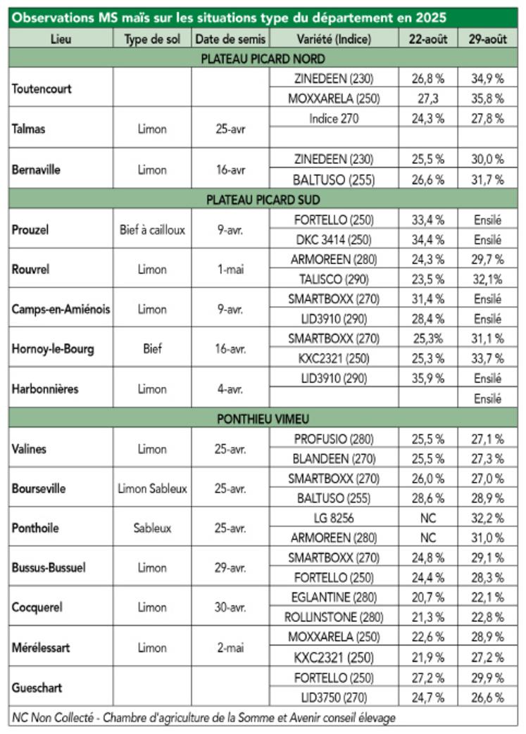 Les maïs récoltés le vendredi 29 août ont pris 4 points de MS, pour atteindre une moyenne départementale de 29,4 % MS. Lors de la préparation des échantillons de maïs, la pluie a fait son apparition, sur le secteur du Ponthieu Vimeu, certains résultats peuvent être impactés par la pluie.