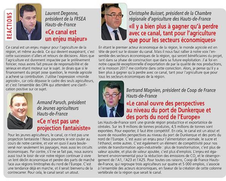 L’agriculture se sent doublement impactée par cette annonce : d’un côté, le canal paraît être un levier de compétitivité pour les intrants et les exportations des marchandises agricoles et agro-alimentaires. De l’autre, le tracé prélève près de 2 000 hectares de terres agricoles, d’ores et déjà mobilisées et mises en réserve. Dès lors, les représentants de l’agriculture ont saisi le chef de l’Etat en personne pour lui rappeler les enjeux et l’importance de ce projet, pas seulement pour l’agriculture, pas seulement pour la région Hauts-de-France, mais bien pour l’économie nationale au sens large. «Quand on veut relancer la France sur les thèmes de l’ouverture économique au monde, de la compétitivité industrielle et de l’exemplarité environnementale, on ne peut pas remettre à demain le projet du canal Seine-Nord Europe : il est l’incarnation même de ce tryptique», rappelle Laurent Degenne, président de la FRSEA Hauts-de-France. Et leur courrier s’accompagne d’une invitation faite au chef de l’Etat de venir sur place discuter du projet. Affaire à suivre.