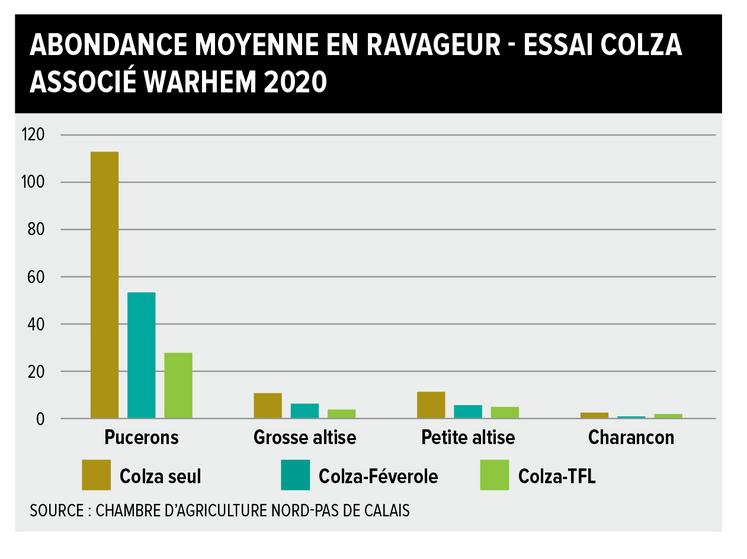 Lors des prélèvements, les pucerons retrouvés sur le colza sont ceux de l’espèce Myzus persicae (puceron vert du pêcher), responsable de viroses. Sur les plantes compagnes, le puceron de la vesce, le puceron noir de la fève et le puceron vert du pois, espèces non colonisatrices et non préjudiciables pour le colza, ont été découverts.