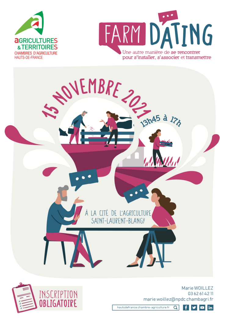 Les Chambres d’agricultures des Hauts-de-France vous proposent un après-midi dédié avec un farm dating le 15 novembre prochain, à l’occasion de la Quinzaine de la transmission. Vous pourrez ainsi rencontrer plusieurs exploitants agricoles cédants à la recherche d’un repreneur ou en recherche d'associé(s). Chaque rencontre durera une dizaine de minutes. « Le but de ces rencontres n’est pas de faire des rendez-vous d’affaires ou des entretiens d’embauche mais bien d’échanger autour des motivations et projets de chacun afin d’avancer dans son projet respectif », précise Marie Woillez, organisatrice de l’évènement. L’après-midi se terminera avec un moment de convivialité.