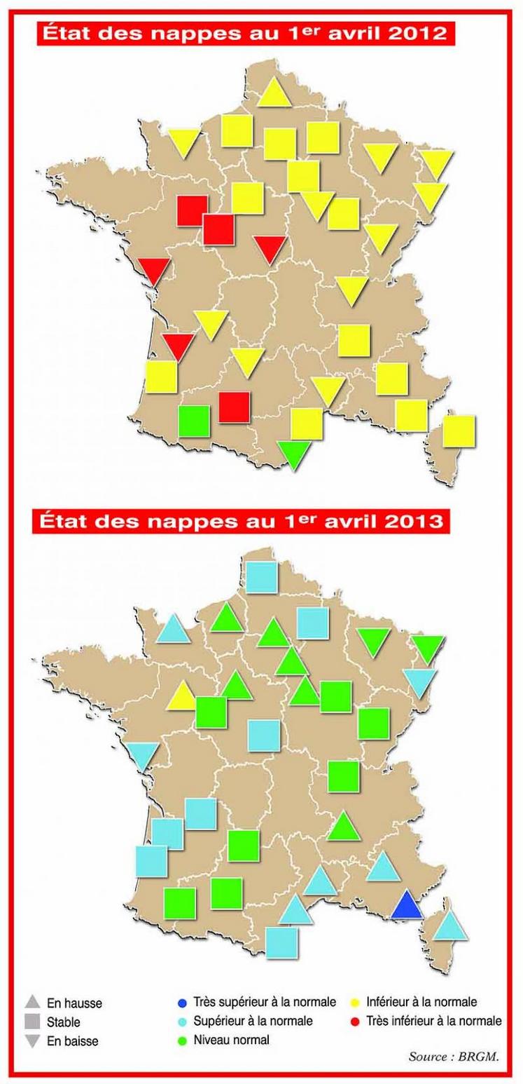 Et en effet, quel changement : sur les deux cartes présentées le 24 avril 2013 par le Bureau de recherches géologiques et minières (BRGM), les effets couleurs parlent d’eux-mêmes : en avril 2013, le bleu et le vert (synonymes respectivement de situation supérieure à la normale et niveau normal) l’emportent largement et surtout constrastent vraiment, de façon positive, avec avril 2012 où le jaune et le rouge (synonymes respectivement de niveau inférieur à la normale et niveau très inférieur à la normale) couvraient quasiment toute la carte de France métropolitaine.