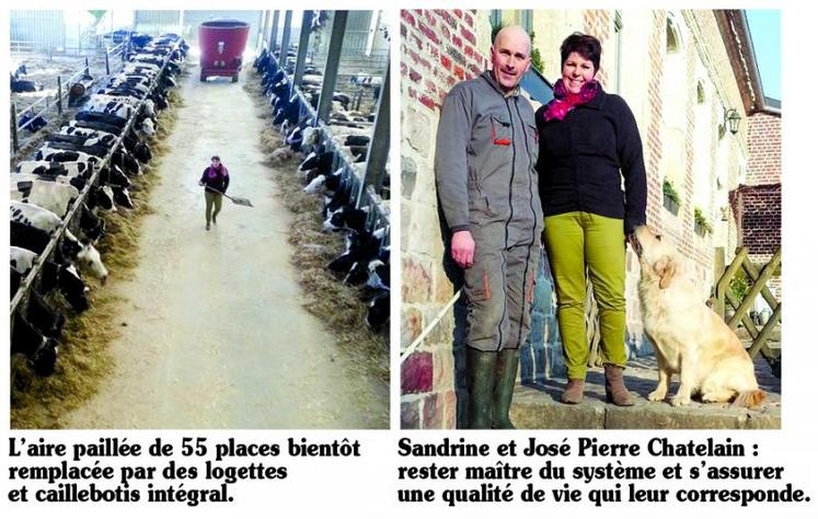 Salarié de Gènes Diffusion pendant quinze ans, José-Pierre Chatelain s’est installé en 2003 avec un quota de 450 000 litres de lait. L’outil de production, mis aux normes en 2005, est aujourd’hui composé d’une aire paillée de 55 places et d’une salle de traite 2x3 tandem ayant une quarantaine d’années d’existence : la traite, réalisée en grande partie par le beau-père de M. Chatelain, prend du temps mais fournit du lait de qualité… Les silos, laissés tels quels lors de la mise aux normes, ont été agrandis et refaits à neuf en 2014 afin d’augmenter la capacité de stockage de l’élevage.