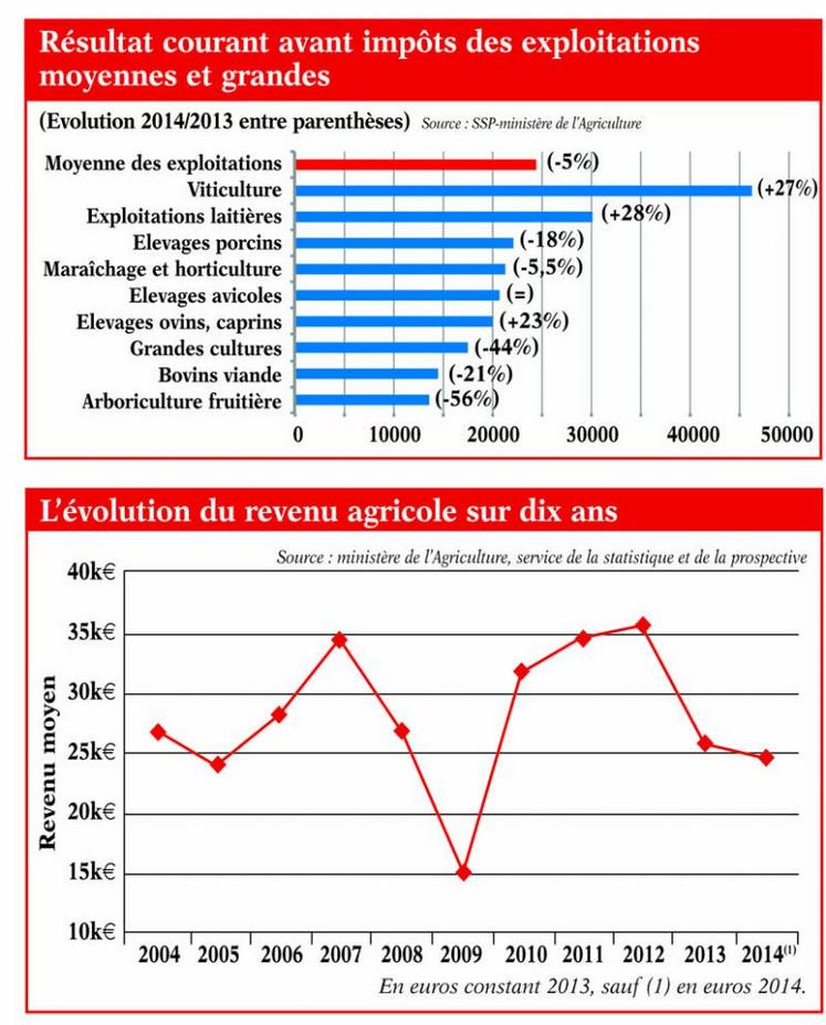 - Dans le paysage agricole actuel, c’est la viticulture qui tire son épingle du jeu. En 2014, le revenu moyen des exploitations viticoles devrait atteindre 46 200 euros.