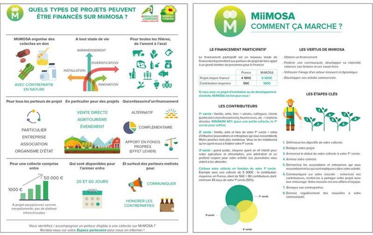 Dans la majorité des cas, le financement bancaire reste la première solution. Cependant, il ne faut pas négliger les autres sources de financement. En voici quelques exemples. Les financements participatifs : Miimosa est le premier site de financement participatif dédié aux acteurs de l’agriculture et de l’alimentation (Cf Infographie). Il existe aussi Hellomerci : après avoir permis de lever plus de 8 millions d’euros pour des projets créatifs et innovants, les fondateurs de KissKissBankBank ont lancé en mai 2013 la première plate-forme de prêts solidaires entre particuliers.