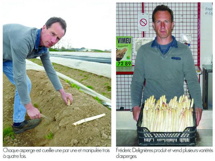 L’asperge de la région est blanche. Elle pousse à l’abri de la lumière sous une butte bâchée. Dès qu'elle sort de terre, elle est cueillie. La cueillette stimule la pousse et c’est en moins de vingt quatre heures que l'asperge pointe sort de terre. «La récolte s’étale sur huit semaines jusqu'à la mi-juin. En diversifiant les variétés, je varie la taille et la précocité. Cultiver une asperge blanche est plus compliqué qu’une verte car il faut la cueillir alors qu’elle est encore dans le sol et la préserver de la lumière», explique Frédéric Delignière. En été, la plante se régénère et stocke les nutriments dont elle aura besoin pour la récolte suivante et à l’automne, les feuilles sont broyées.