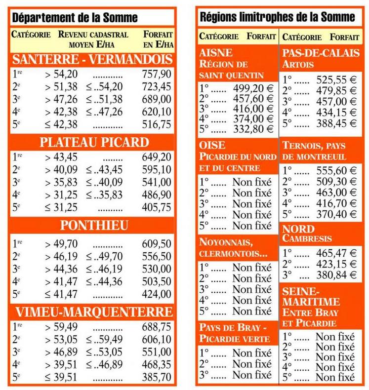 Il s’obtient en multipliant la superficie imposable (déclarée avant le 1er avril par l’imprimé n° 2 342 au service des impôts) par le forfait indiqué dans le tableau ci-contre.