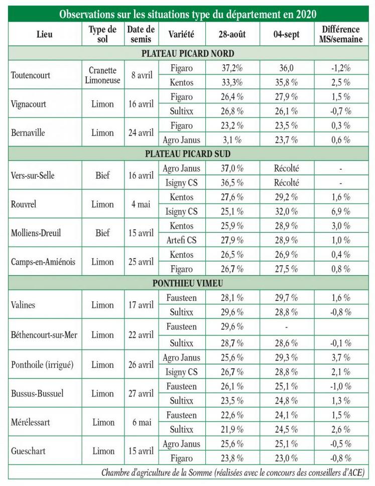 En cette quatrième semaine de suivi matière sèche maïs réalisé par la Chambre d’Agriculture de la Somme et d’ACE, les résultats ont peu évolué. En effet, les échantillons de maïs ensilage ont été ramassés ce vendredi 4 septembre dernier sous la pluie. Cela a donc une incidence sur l’estimation de la matière sèche. Sur le terrain, d’après nos observations, les maïs ont pris + 1,5 points.
