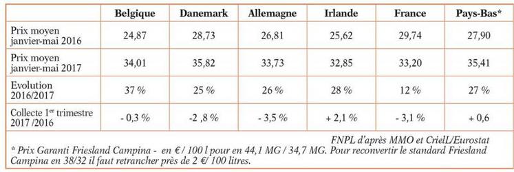 Comparé à 2016, les prix du lait chez nos voisins européens ont connu une nette remontée, comme le révèlent les prix à taux réels €/100 kg communiqués par le MMO. La France avec une augmentation de seulement 12 % sur les cinq premiers mois de l’année, est à la traine de l’Europe laitière, tant en évolution qu’en valeur.