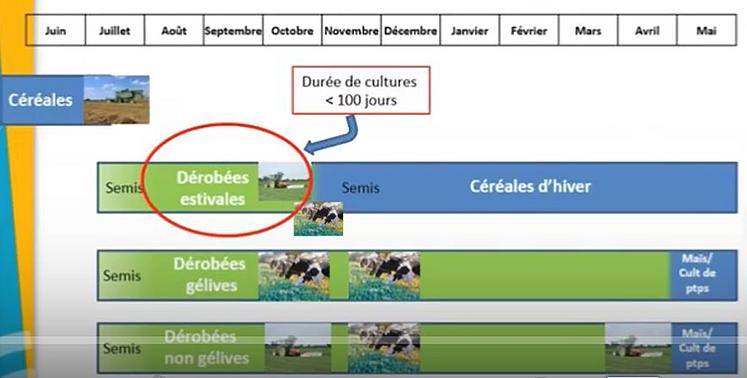 La date de semis de ces dérobées dépend de leur composition du couvert et des familles choisies. Par exemple, les légumineuses ont besoin de lumière pour se développer et seront semées tôt. Les graminées offrent plus de latitude dans les dates de semis. Tout dépend de la durée de végétation des espèces.