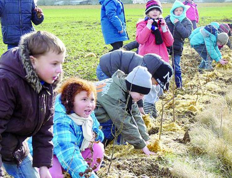 Les écoliers de CE1 et CE2 de Lignières-Châtelain ont été invités par le maire à planter des arbustes de haie en rive de la route de Lignières à Bettembos. C’est avec beaucoup de joie, d'enthousiasme et de dynamisme que les élèves de madame Marie ont accompli leur tâche. Avant de mettre les mains dans la terre Hubert Avet a expliqué son projet et a répondu aux nombreuses questions. La biodiversité, la protection de l'environnement, les problèmes générés par le vent, l'eau, l'érosion des sols, le paillage ont été évoqués, constituant maintes pistes de travail en classe. Nul doute que ces travaux pratiques auront été appréciés et que les enfants surveilleront avec intérêt la croissance de leur haie.