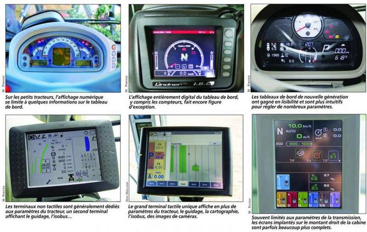 L’affichage numérique s’est généralisé sur les tracteurs, mais à des niveaux très variés selon les marques et les modèles. En-dessous de 100 chevaux, seul le tableau de bord dispose d’un petit écran aux informations généralement sommaires. L’absence d’indication de la consommation et même parfois du régime de prise de force est à déplorer dans de nombreux cas. Au-dessus de 100 chevaux, bon nombre de modèles accèdent à des écrans de tableau de bord plus fournis, complétés dans certains cas par un écran sur le montant droit de la cabine, ce dernier étant le plus souvent dédié aux paramètres de la transmission. À noter que les marques d’outre-Atlantique font l’impasse sur le tableau de bord central pour leurs gros tracteurs. Les informations sont alors regroupées sur le montant droit de la cabine.