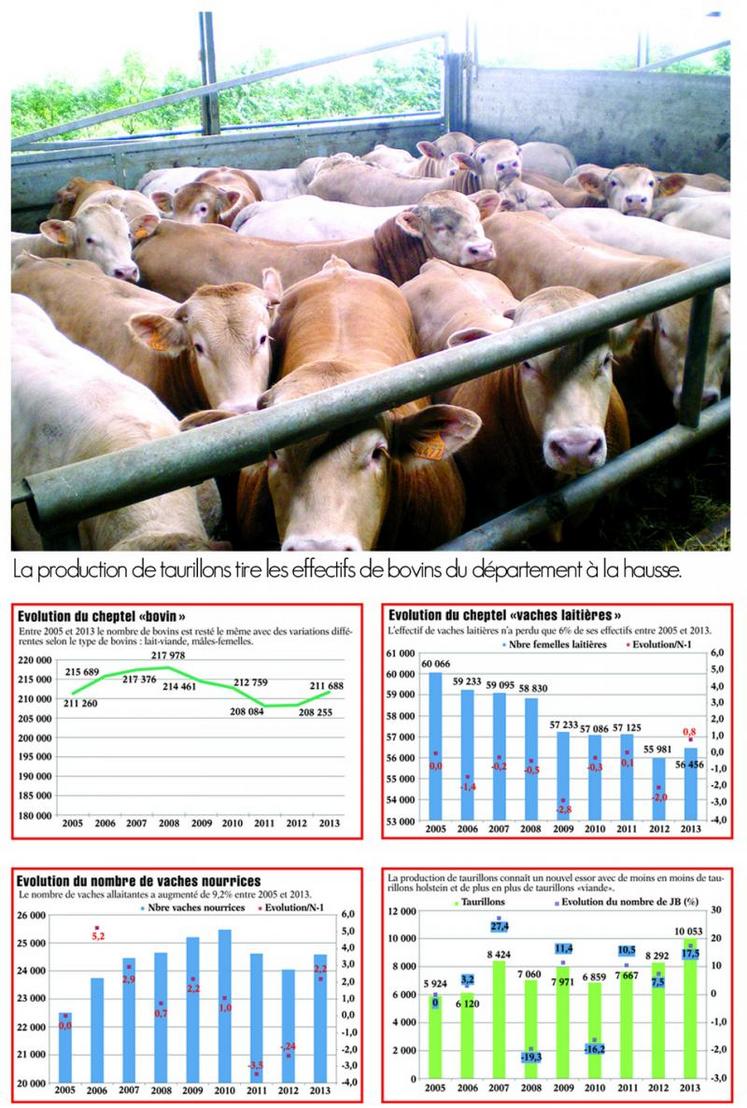 L’élevage départemental est en restructuration régulière et permanente, et les tendances sont les mêmes sur les départements voisins. La présence de l’élevage est un moteur important et contribue à la valeur ajoutée du département. Contre tout préjugé, entre 2005 et 2013 le nombre de bovins est resté le même.