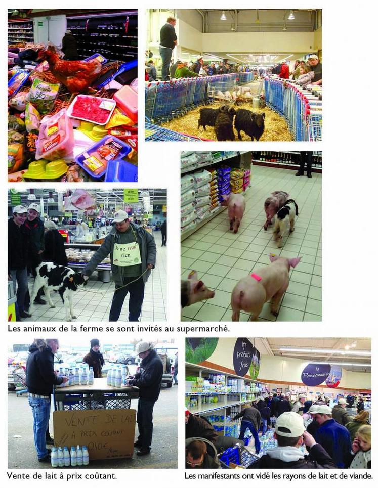 Samedi 2 mars, une centaine de manifestants se sont retrouvés devant deux supermarchés, Carrefour et Leclerc, de la métropole amiénoise. Cette fois, les manifestations se sont déroulées dans la journée, aux heures de grande affluence. Les manifestants ont donc pu expliquer leurs revendications aux consommateurs. Ces derniers ont eu des réactions mitigées : certains en colère, d’autres encourageant les éleveurs à poursuivre leurs actions. Les manifestants ont éparpillé de la paille, mis des animaux et des caddies dans la galerie marchande des deux supermarchés. Le ton s’est durci au cours de la journée dans l’un des deux magasins: les rayons de viande et de lait ont été vidés. Le directeur ne souhaitait pas rencontrer les éleveurs. Toutefois une délégation est allée à sa rencontre afin de lui présenter la situation et lui demander des explications. Ce dernier doit donner des réponses au cours de la semaine.