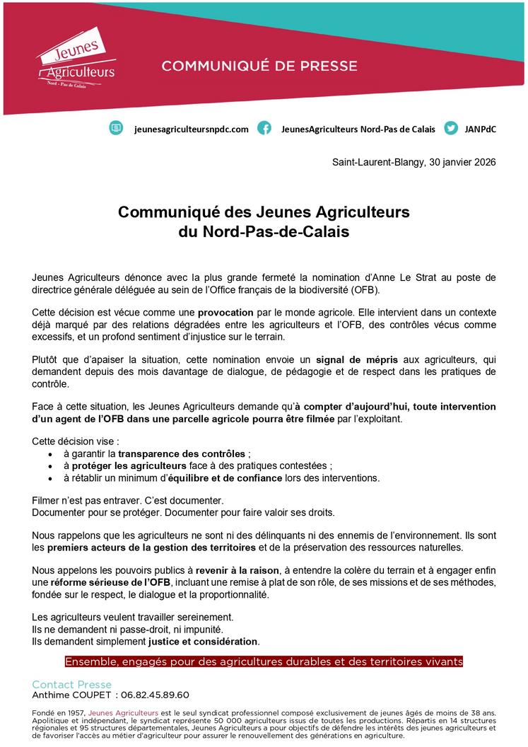 Dans un communiqué du 30 janvier, les Jeunes Agriculteurs du Nord-Pas de Calais dénoncent « avec la plus grande fermeté » cette décision, qu’ils estiment « vécue comme une provocation par le monde agricole ». Elle intervient, rappellent-ils, « dans un contexte déjà marqué par des relations dégradées entre les agriculteurs et l’OFB, des contrôles vécus comme excessifs, et un profond sentiment d’injustice sur le terrain ».