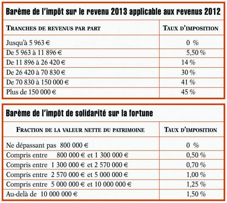 Le barème de l'impôt sur le revenu ne sera pas indexé sur l'inflation pour les revenus de 2012, imposés en 2013. Cette non-indexation équivaut à une hausse d'environ 2 % de l'impôt. Un système de décote s’appliquera aux foyers dont l’impôt n’excède pas 960 ; c’est par exemple le cas d’une famille avec deux enfants déclarant moins de 35 300 € de ressources taxables (voir tableau barème de l’impôt sur le revenu 2013).