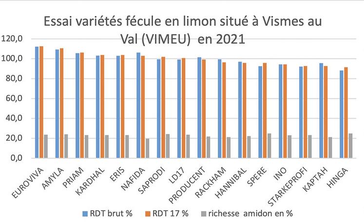 Dans cet essai et dans le contexte de l’année, les variétés comme Euroviva et Amyla sortent en tête avec un rendement à plus de 110 % de la moyenne de l’essai et des richesses en amidon à plus de 23,7 %. Les variétés Priam, Kardhal, Eris, Nafida, LD17 et Producent restent productives avec de bons rendements compris entre 106 et 100 % de la moyenne de l’essai. Plus décevant cette année, la Rackham avec un rendement de 96,4 %.