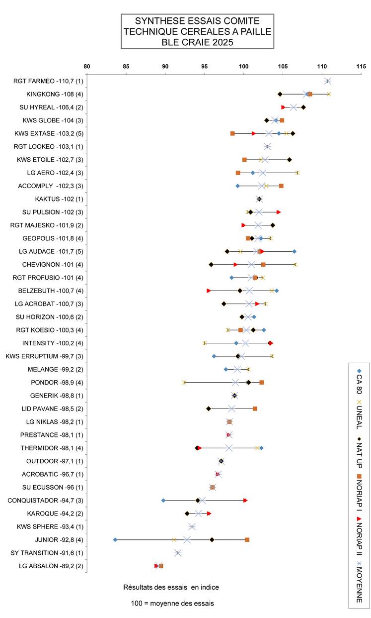 Cette liste variétale est réalisée sur la synthèse des essais du Comité Technique Céréales à Pailles de la Somme (2025 et pluriannuels sur 6 années) et les observations en parcelles agriculteurs. (Rendements des essais exprimés en indice ; 100 % = moyenne des essais).