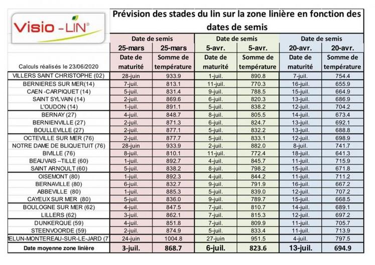 Pour ne pas récolter à sur-maturité ou à sous-maturité, l’observation des plantes peut être complétée par l’étude des besoins physiologiques en somme de températures des lins pour arriver à maturité. Pour une variété précoce en lin de printemps, le début de la maturité des fibres à partir de 850°C base 5. A partir de cette date, les lins peuvent être arrachés.