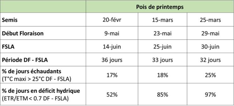 À partir de la floraison, la majorité des composantes de rendement des protéagineux se met en place telle que le nombre de grains/m² et le remplissage pour les premiers étages fructifères. Tout stress hydrique ou thermique (>25°C) survenant à cette période peut lourdement impacter le nombre de grains par m² par des avortements de fleurs et de jeunes gousses. La compensation est souvent difficile à ce stade, seul un bon remplissage pouvant rattraper partiellement le potentiel.