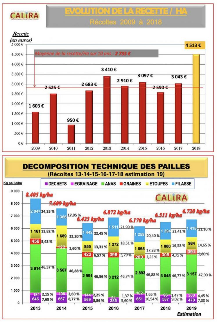 Salle plus que comble, ambiance apaisée et positive, sourires. Pas besoin de regarder les diapositives pour savoir que l’année a été excellente pour la Calira dans sa filière. Et pour cause, la récolte 2018 dont l’assemblée générale marque la clôture restera dans les annales : record de surfaces, mais aussi et surtout, recette record ! En effet, la Calira voit sa recette moyenne nette marquer un plus haut historique à 4 513 €/ha teillage déduit ! Un montant quasi-comparable au double de la moyenne des dix dernières années. Plusieurs facteurs expliquent cette performance : en premier lieu, une année ou les conditions de température et de pluviométrie ont permis d’aborder la phase de récolte avec des lins homogènes et droits. Cette matière a bénéficié ensuite de bonnes conditions de rouissage, et 100 % des surfaces étaient récoltées au 6 septembre 2018. Au final, les lins récoltés en 2018 faisaient en moyenne 6,5 t de paille à l’hectare, avec une richesse de 21,4 %, soit 1,4 tonne de filasse par hectare. Parallèlement, le marché de la fibre a lui aussi connu une évolution très positive : les fibres de très bonne qualité (significatives en 2018) ont vu leur prix se renforcer régulièrement dès l’hiver 2018-2019 pour atteindre un plus haut historique au printemps 2020. Tous ces éléments se sont combinés favorablement, et la recette moyenne nette de teillage des adhérents de Calira a bondi de près de 1 500 € par rapport à l’année précédente, qui se situait à 3 043 €.