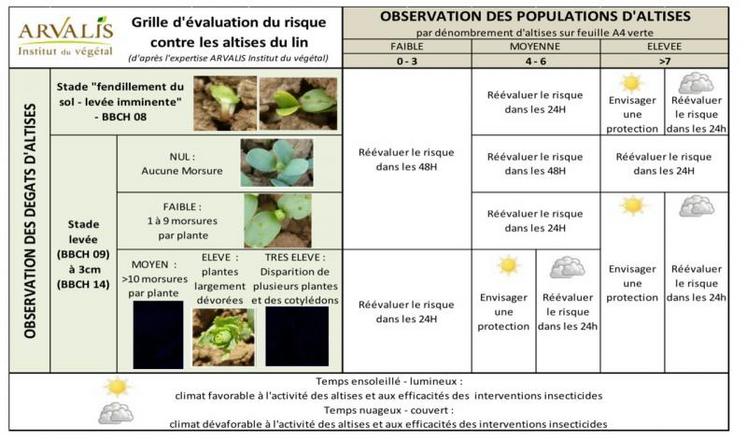 La prise en compte de l’intensité des dégâts observés, de la population d’altise relevée, du stade de la culture et de la météo permet de mettre en œuvre une grille de décision des interventions : une stratégie de lutte chimique adaptée en fonction de la pression.