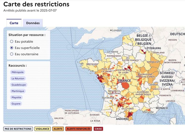 Selon la ministre de la Transition écologique, Agnès Pannier-Runacher, la situation sur le front de la sécheresse est jugée préoccupante, a-t-elle indiqué lors d’un déplacement le 7 juillet à Orléans. « 18 départements sont en situation de crise et 48 départements font l’objet de mesures de restriction (…) alors même que les nappes ne sont pas dans une situation très dégradée par rapport à 2022 et 2023 », a-t-elle affirmé.