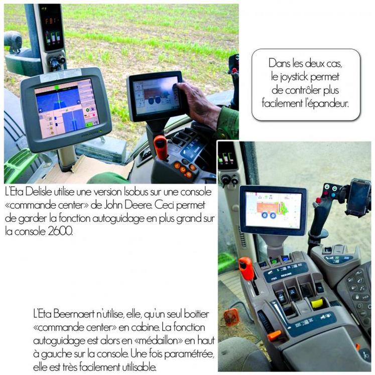 • La suppression d’un boitier en cabine : l’application «Dangreville» est utilisée dans un boitier 2600 John Deere pour l’ETA Beernaert et par la console «commande center» pour l’ETA Delisle. Ceci permet d’utiliser très facilement la fonction d’autoguidage GPS en même temps, tout en conservant la lisibilité.