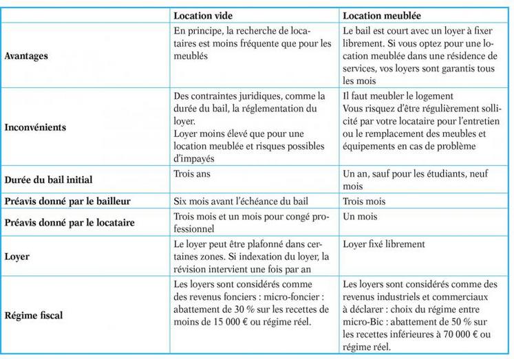Si les loyers des locations vides sont considérés comme des revenus fonciers, ceux des locations meublées sont considérés comme des revenus industriels et commerciaux. Et, dans ce dernier cas, si vous pouvez bénéficier du régime micro, l’abattement est alors de 50 % contre 30 % en location nue, voire 71 % pour les logements classés de tourisme. Fiscalement parlant, le régime Bic des locations meublées est plus intéressant et s’adresse aux particuliers qui ont moins de 70 000 € de recettes, au lieu de 15 000 € pour les locations nues. Au bénéfice réel, en régime Bic, on peut amortir le bien. Ce n’est pas le cas en location nue. Autre aspect : louer en meublé oblige à un turnover plus fréquent et nécessite des travaux de rafraîchissement plus réguliers, notamment pour les objets mobiliers (literie, électroménager, …). Ce qui permet peut-être de maintenir son logement «en bon état» par rapport à une location nue. Selon les agences, les frais de gestion d’un meublé sont supérieurs à ceux d’une location nue.
