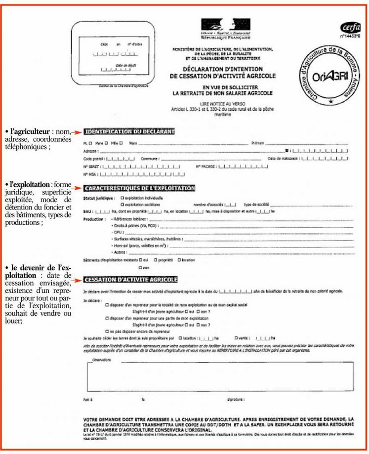 Rassurez-vous : c’est bien vous qui déciderez de la date de votre départ en retraite. Mais pour favoriser la transmission des exploitations et l’installation de nouveaux agriculteurs, la loi d’orientation de 1999 demande aux exploitants de déclarer leur intention de cesser leur activité auprès de la chambre d’agriculture. Ce formulaire doit être retourné dans les 18 mois au moins avant le départ prévu en retraite.