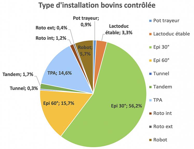 Parmi les élevages contrôlés en 2020, les robots de traite représentaient 9 % du parc matériel soit 5,7 % des éleveurs avec un cheptel moyen de 88,2 VL, soit