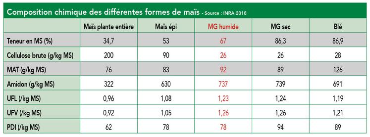 Le maïs épi, aussi appelé «maïs grain humide avec rafle», est récolté lorsque l'épi est mûr, souvent à un taux de matière sèche se situant entre 50 et 60 %, soit lors de l’apparition du point noir. Cette technique consiste à ne récolter que la carotte (épi et rafle). Les caractéristiques nutritionnelles de l’aliment ainsi obtenu s’éloignent de celle d’un aliment fourrager. Le maïs épi présente une haute teneur en énergie. Il est riche en amidon et apporte une forte densité énergétique dans la ration. En comparaison à l’ensilage de maïs classique, le maïs épi offre une meilleure digestibilité. Enfin, grâce à la présence de la rafle, qui apporte des fibres, le maïs épi offre un apport équilibré en énergie et en fibres, réduisant le risque d’acidose ruminale (problème fréquent lorsque les rations sont trop riches en amidon et pauvres en fibres).