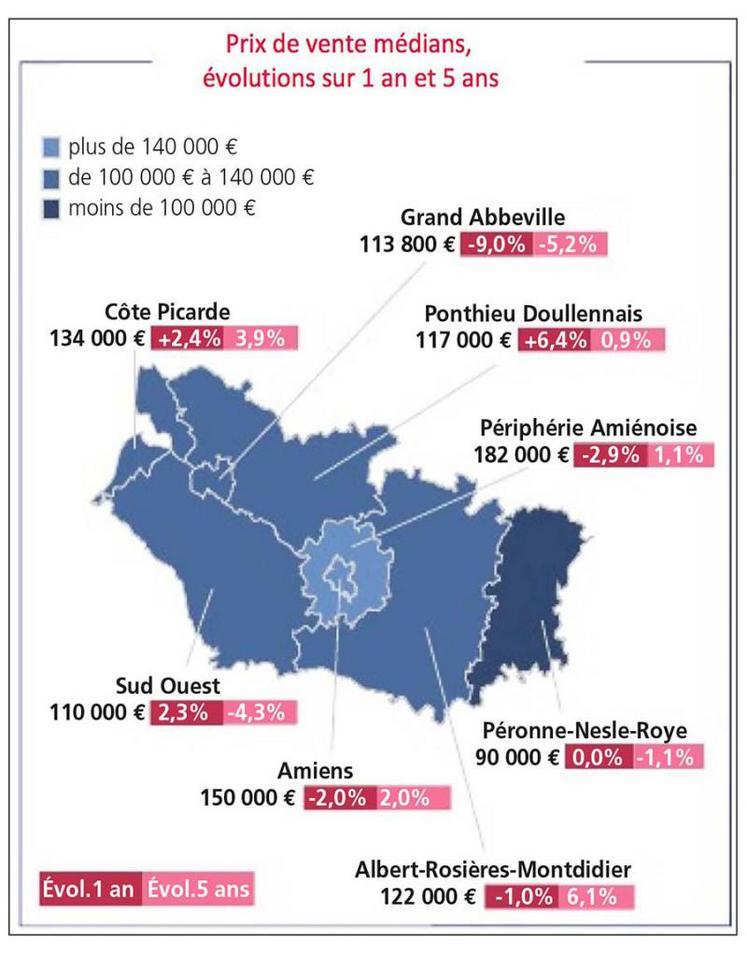 A Amiens, le prix médian le plus cher est à Henriville (243 200 €), suivi d’Amiens Sud (234 500 €), de Sainte-Anne - Saint-Acheul (160 000 €), du Faubourg de Hem et Saint-Roch (130 000 €), du Faubourg de Beauvais (128 000 €), de Saint-Pierre - Saint-Maurice (126 000 €) et d’Amiens Ouest (127 000 €). La moyenne, pour Amiens, est de 150 000 €.