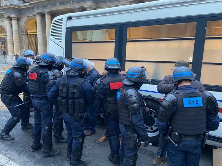 Cette action coup de poing a permis aux agriculteurs d’accrocher des banderoles sur les grilles du Conseil d’État : « Conseil des juges – République des juges ». Des feux de paille et de palettes ont été allumés. La manifestation a été dispersée par la police vers 07h30. Dans la matinée, plusieurs dizaines de personnes ont été interpellées et des contrôles d’identité ont été effectués, avant d’être placées en garde à vue dans plusieurs commissariats de la Capitale.