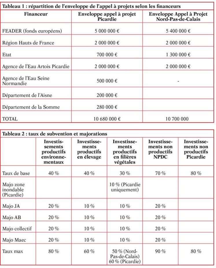 La liste des investissements éligibles diffère entre le Nord-Pas-de-Calais et la Picardie. Par rapport aux précédents appels à projets, quelques investissements ont été ajoutés, comme les équipements de biosécurité en élevage porcin.
