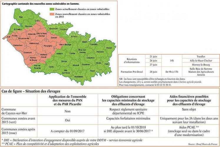 Les nouvelles zones vulnérables depuis 2015 doivent respecter l’ensemble des mesures du PAN et du PAR Picardie à compter du 1er septembre 2017 (voir tableau). Concernant les obligations de capacités minimales de stockage des effluents d’élevage, une Déclaration d’intention d’engagement (DIE) est à compléter et envoyer à votre DDTM au plus tard le