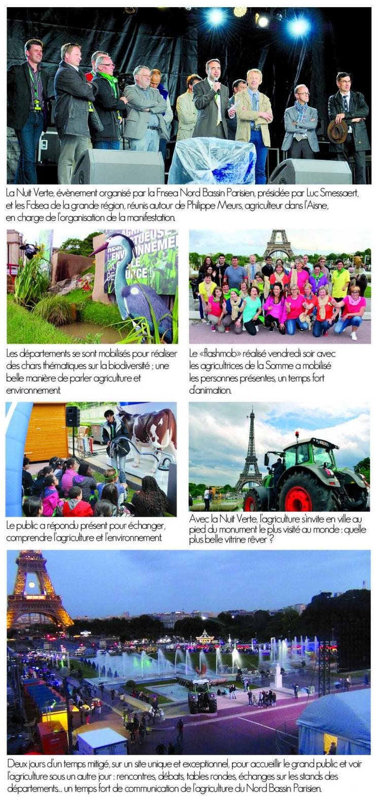 Après une première édition réussie en 2012, les agriculteurs de la Fnsea Nord Bassin parisien ont souhaité réitérer l'évènement cette année en étendant la Nuit Verte sur deux jours, du vendredi 23 mai après-midi au samedi soir 25 dans les jardins du Trocadéro. Plus de 1 500 agriculteurs étaient présents sur les deux jours pour échanger avec les visiteurs, des professionnels pas forcément rodés aux actions syndicales et qui souhaitaient simplement faire découvrir leurs pratiques. Pas de grands discours donc, mais la démonstration concrète que l'alliance entre agriculture et biodiversité est une évidence au coeur des territoires, à travers la présentation d'expériences issues des exploitations de la région. La France possède une grande diversité d'espèces animales et végétales qui font la beauté de ses paysages, explique Christiane Lambert, vice-présidente de la Fnsea, ajoutant que «cette richesse existe aussi parce que les agriculteurs l'ont préservé».