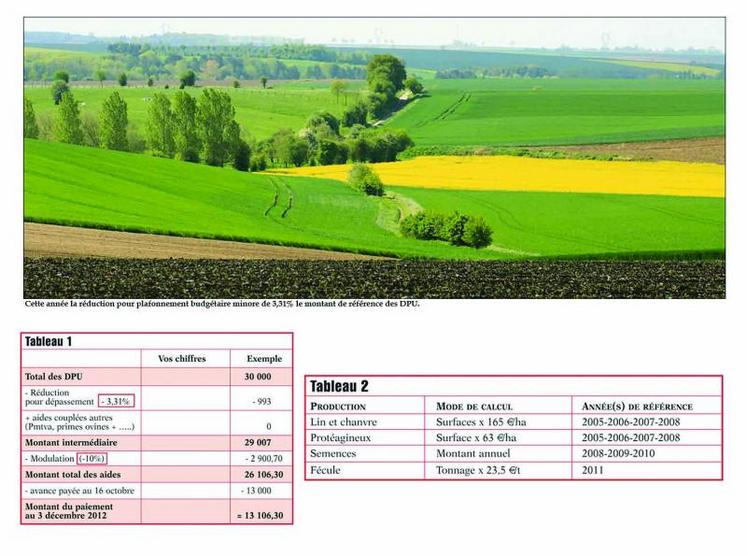 A ce montant minoré vient s’ajouter l’ensemble des aides couplées connues et activées, notamment les primes ovines et la Pmtva. Ceci donne le montant total individuel des aides avant modulation. A celui-ci s’applique ensuite la modulation ; celle-ci s’élève à 10% en 2012. Dès lors, vous disposez du montant total des aides avant découplage 2012 (lin, chanvre, fécule, protéagineux, tabac…) et en déduisant le montant déjà versé, cela donne le montant du paiement de cette semaine (cf. tableau 1).